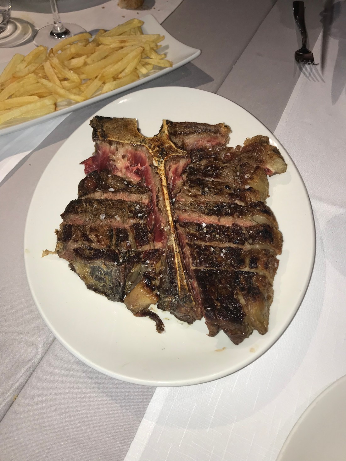 ➂ y ➃ Txuleton 🥩 (39€/kg): Nos pusieron un txuleton de 1,220 kg de vaca frisona. Al punto, jugoso, sal perfecta… en definitiva, no estaba tan bueno como el t-bone, pero tampoco tenía mucho que envidiarle. Hace mucho que tengan una brasa en el restaurante, y que no lo hagan en una cocina convencional.