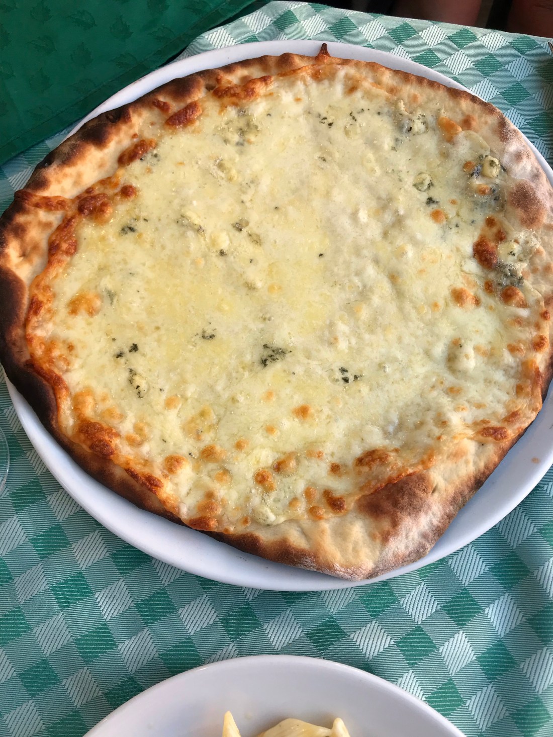 ➎ ➏ Pizza quattro formaggi 🍕🧀🧀🧀🧀 (8€): Pizza con mozzarella, gorgonzola, scamorza y escamas de pecorino. Como siempre, no puede faltar… 🧀