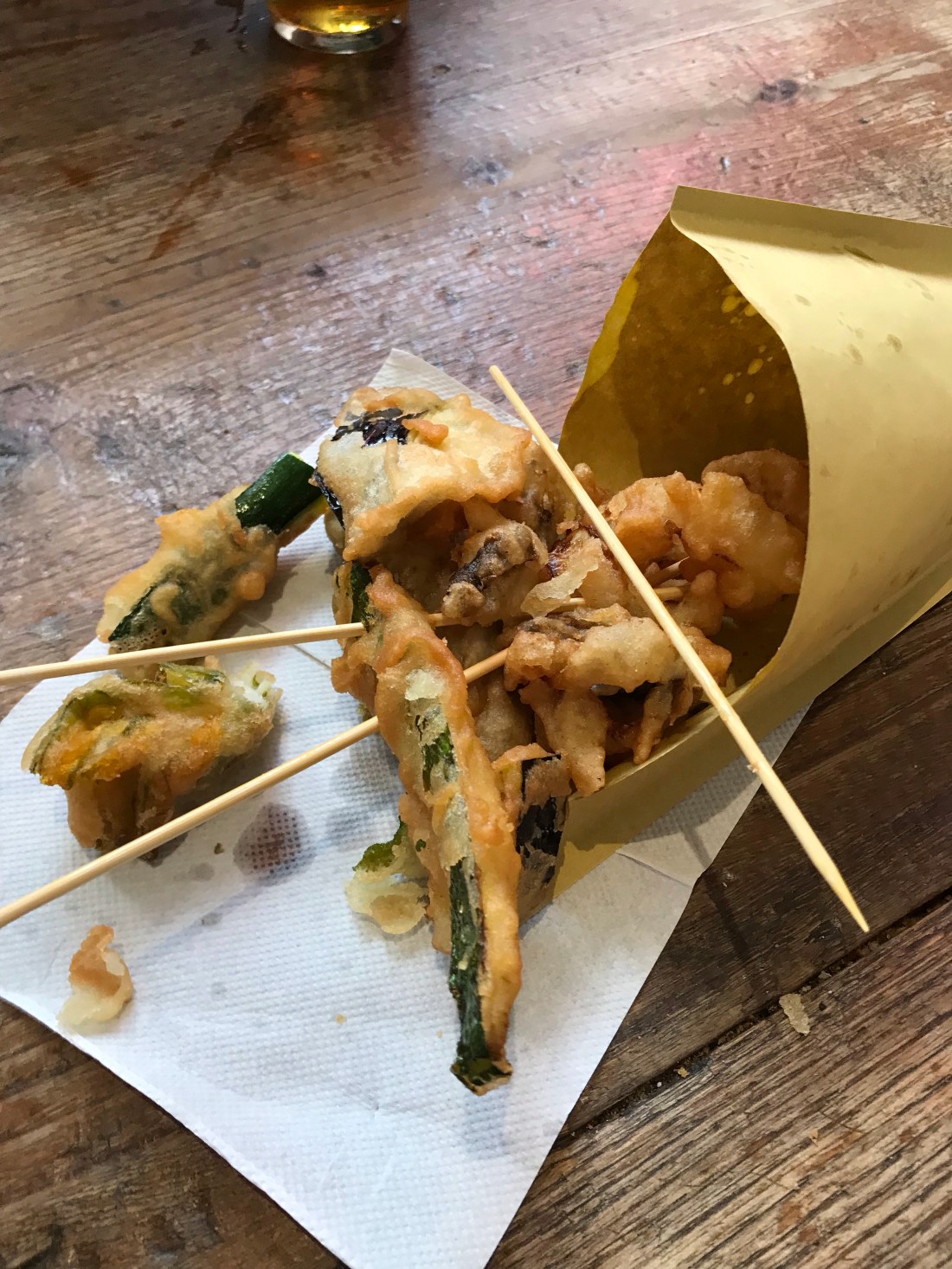 ➊ ➋ Fiori di Zucca 🌷🎃, Funghi 🍄, Melanzane 🍆, Zucchine 🥒, Salvia (5€/r): Como comenté hace dos publicaciones, la verdura en tempura es muy típica de la Toscana y del Lazio. Aquí, en el “Mercato Centrale” puedes pedir raciones variadas.