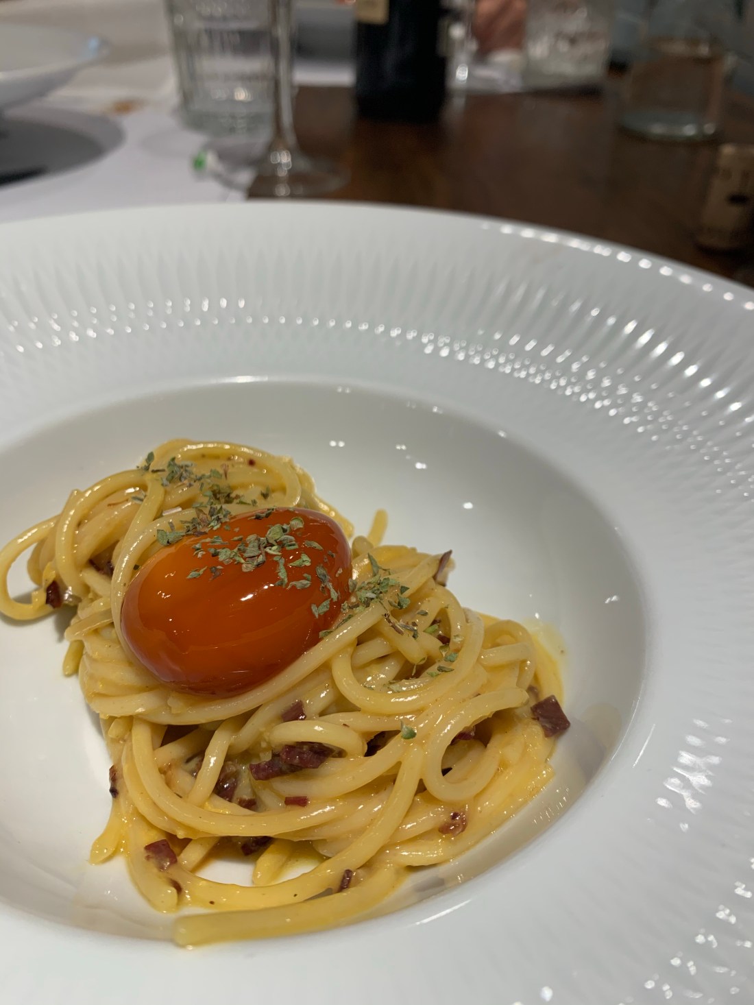 ➊ ➋ Spaghettis carbonara con yema 🍝🥚: Una pequeña yema macerada en soja que le da un toque amargo a la pasta, fusionando perfectamente con la carbonara y los trocitos de jamón.