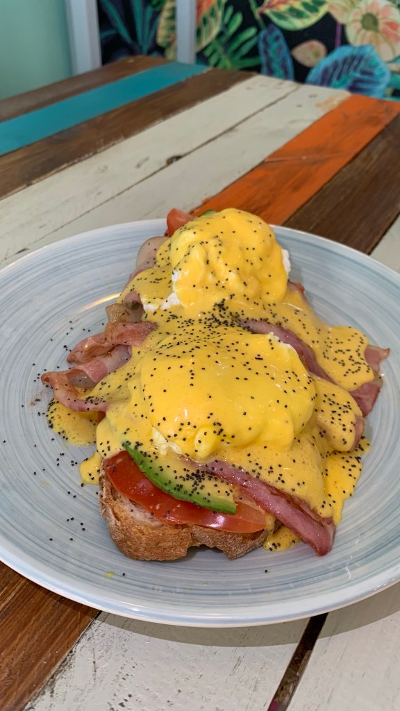 ➊ ➋ ➌ Huevos benedict con bacon 🍞🥚🥑🍅🥓 (8,50€): Tosta de pan de masa madre, aguacate, tomate, bacon y una increíble salsa holandesa!!!!
