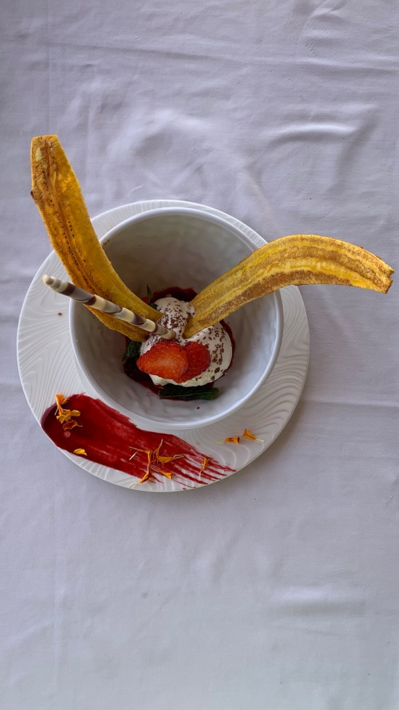 ➊ ➋ ➌ ➍ ➎ Helado de chocolate blanco con sopa de explosión de frutos silvestres 🍨🍫🍓🫐 (7,80€): Con fresas, moras, arándanos y peta-zetas, por un lado; y menta, chocolate y plátano frito, por otro.
