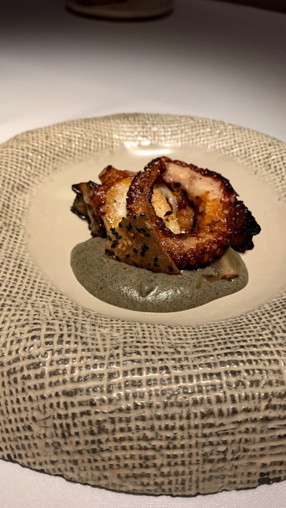 ➂ Pulpo a la brasa 🐙🔥🐖 sobre cerdo a la brasa con puré de berenjena ahumada y cebolla encurtida.