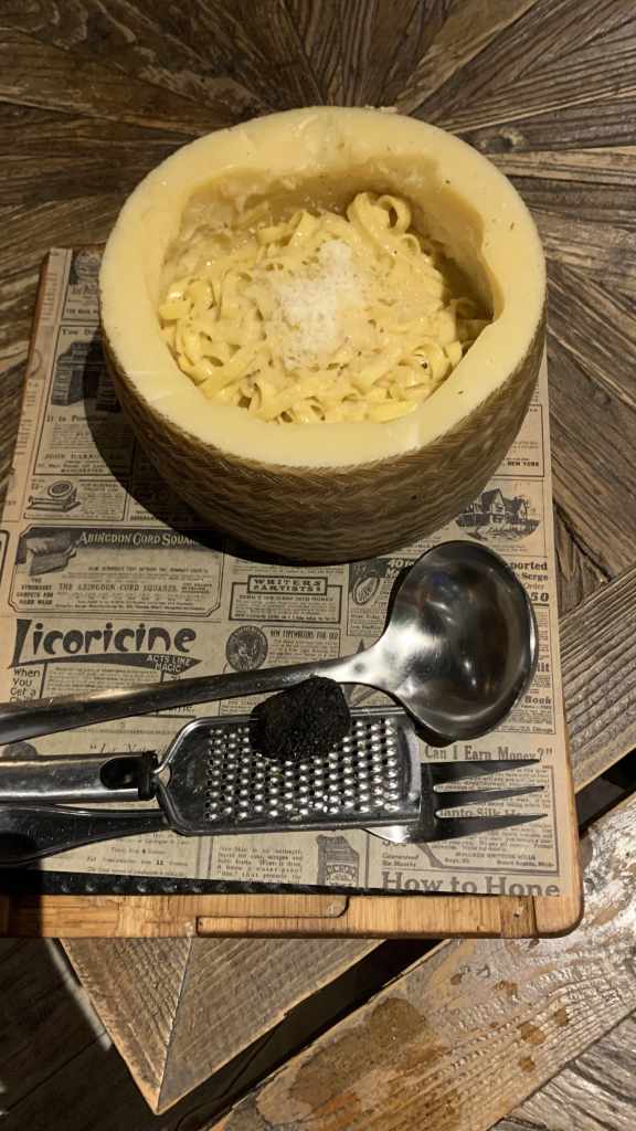 ➊ ➋ ➌ ➍ ➎ Tagliatelle con trufa de temporada y cremoso de queso 🍝🧀🧀 (36€/2p): Servidos en el auténtico queso Pecorino romano 🧀