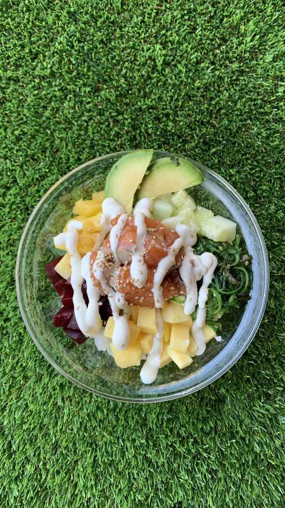 ➀ ➁ ➂ Poke tropik 🍛🐟🥭🍍 (9,90€): Arroz, salmón, piña, mango, wakame, pepino, aguacate, sésamo, remolacha y wasabi.