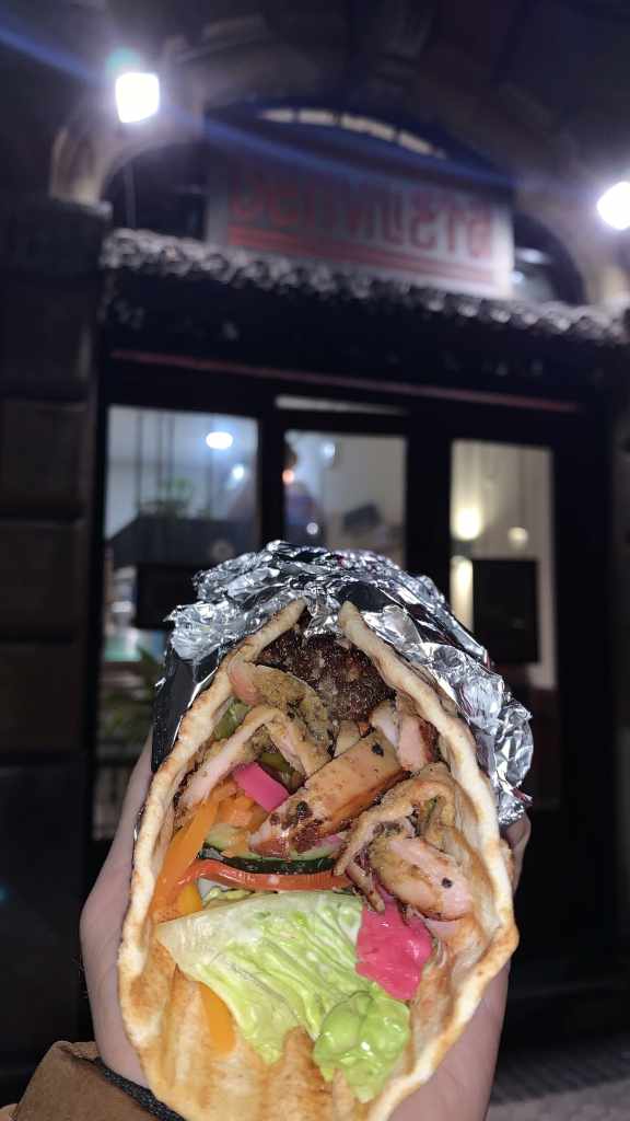 ➀ ➁ ➂ ➃ Shawarma mixto 🌯🌶🧅 (7,50€): Mixto de vaca vieja y pollo con cebolla morada, guindilla, salsa tahina y salsa picante.