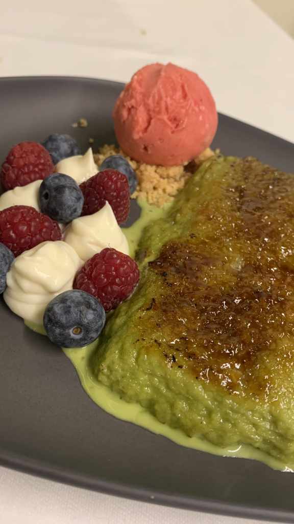 ➊ ➋ Torrija de té matcha 🍞🍵🫐 (6,50€): Caramelizada con crema de chocolate blanco y frutos rojos, y acompañada de un helado de frambuesa. Si te gusta el toque amargo del té matcha (no es mi caso), este es tu postre!!!