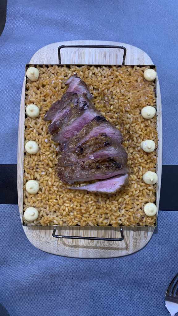 ➀ ➁ ➂ Arroz a la brasa de presa 100% ibérica con ali oli de ajo asado 🥘🥩 (24€): El plato ideal para compartir y ver la esencia brasera 🔥 de monocromo. Aún así, me gustaría ver algún otro ingrediente por encima (solo tienen presa 🥩 o langostinos 🦐) y un toque picante no le iría nada mal 🌶