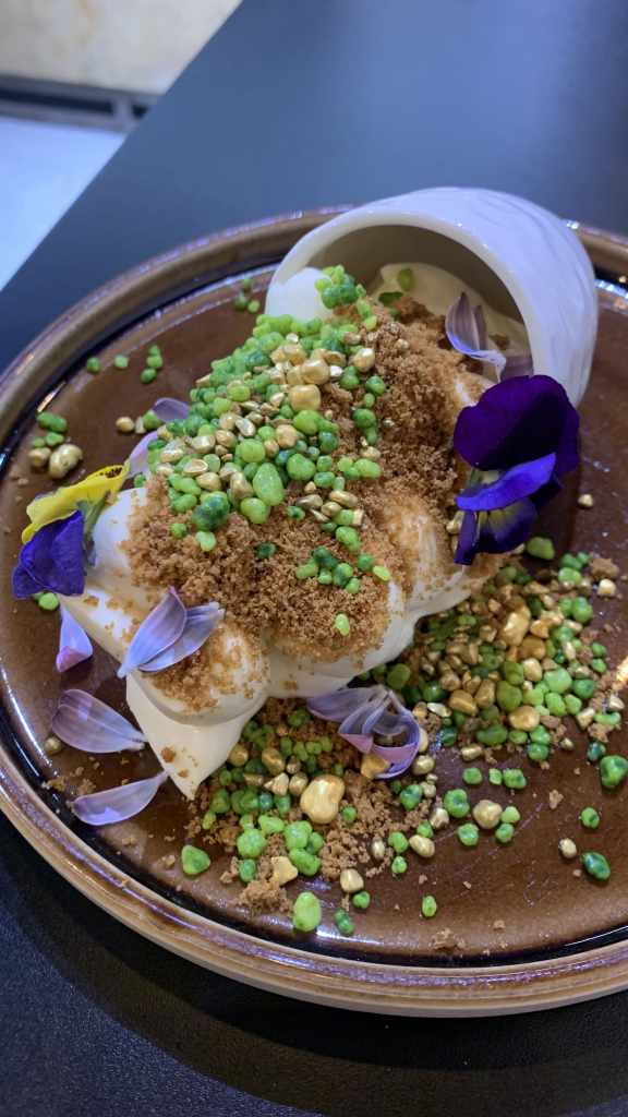 Tenía un ligero toque ácido del yuzu y se comía con crumble de speculoos, un crujiente de las clásicas galletas Belgas de Lotus, y peta-zetas dorados 💥