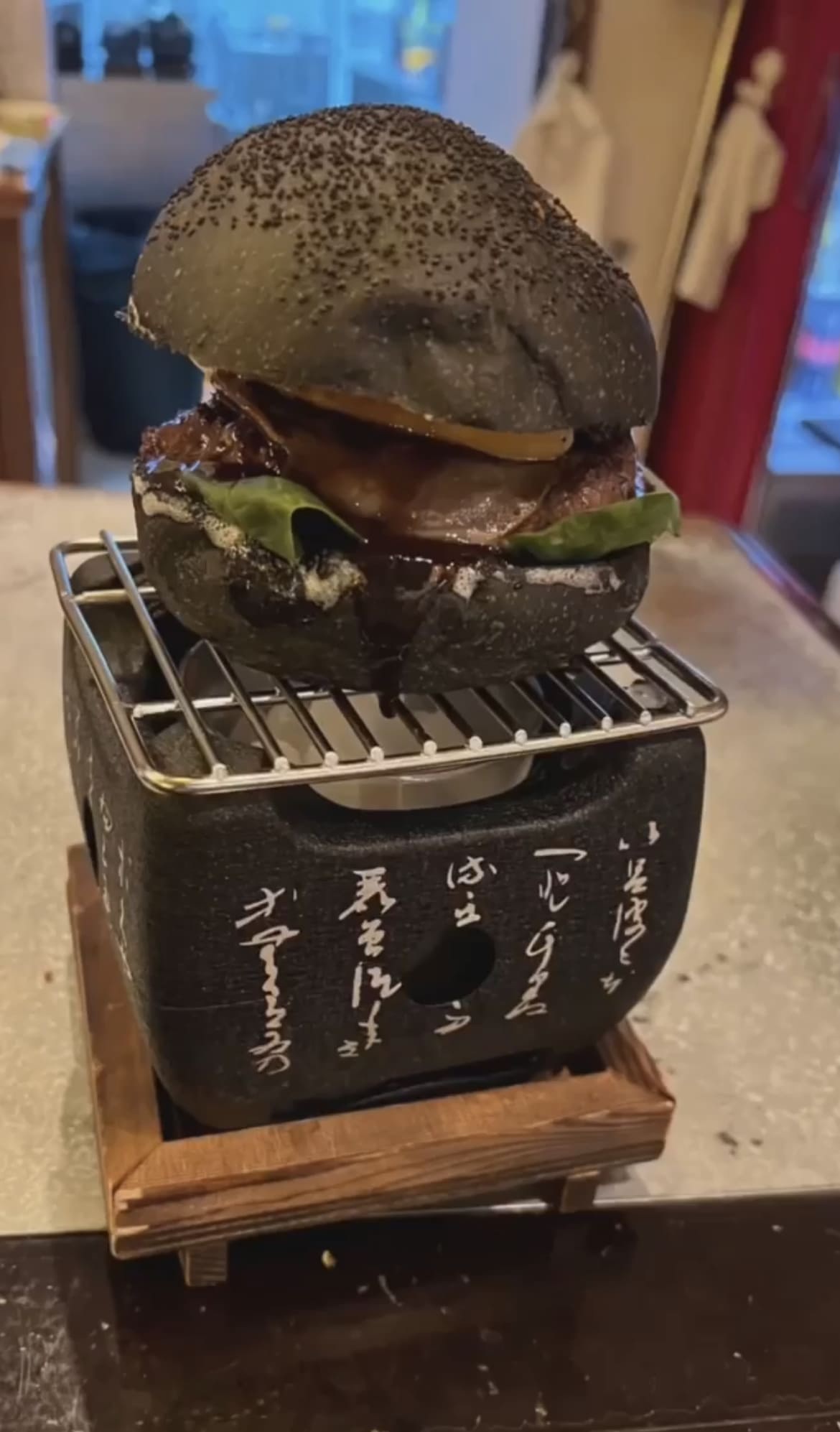 ➍ Antzarrak 2.0 🍔🦆 (15,90€): Bun Bioche de carbón, mayonesa de trufa, baka vieja, velo de papada ibérica, foie fresco a la plancha rúcula y reducción de kalimotxo.