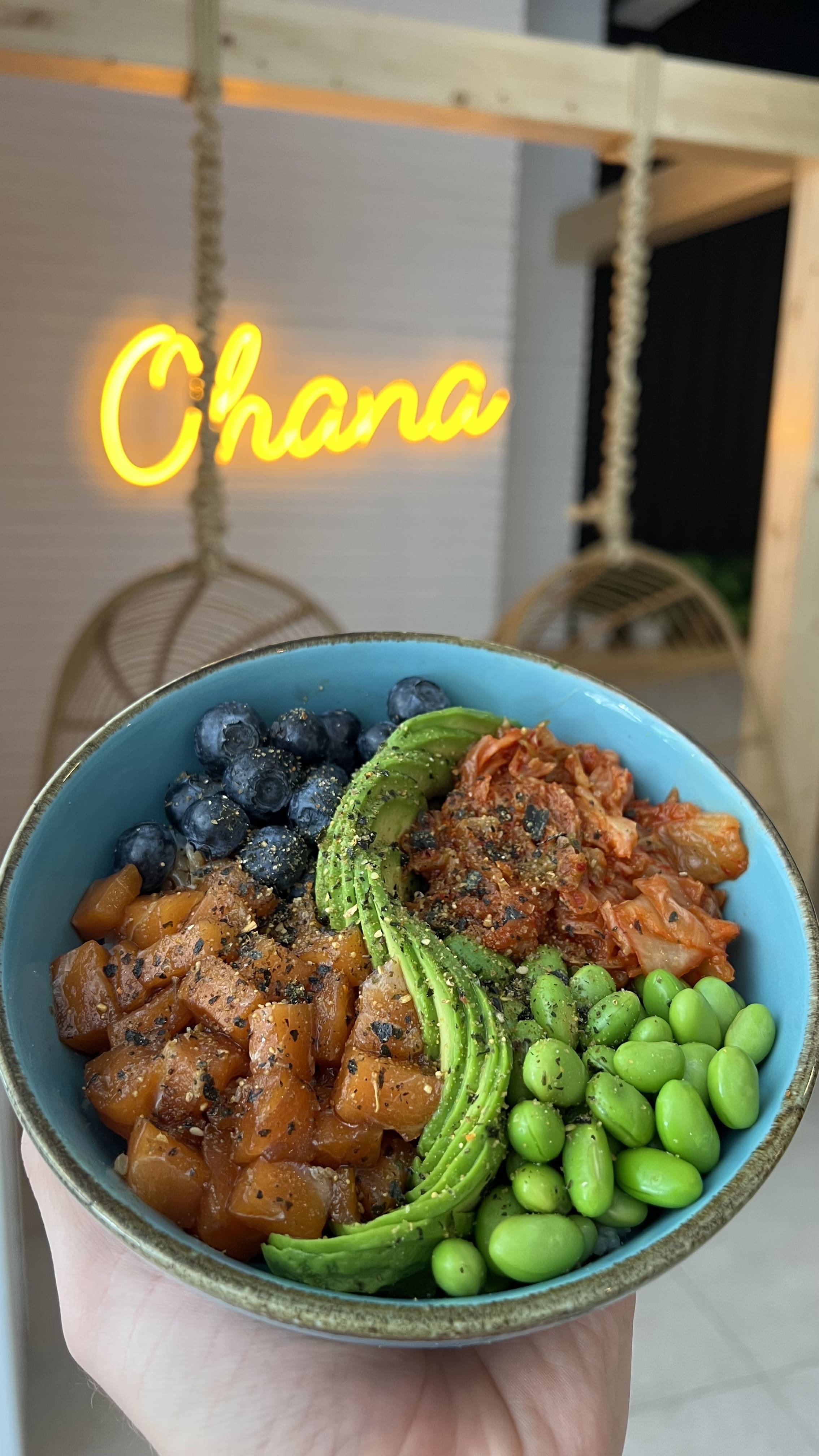 ➀ ➁ ➂ Umami salmón poké 🍚🐟🥑🫐 (9,95€): Salmón, edamame, arándanos, aguacate, kimchi, furikake y salsa teriyaki.